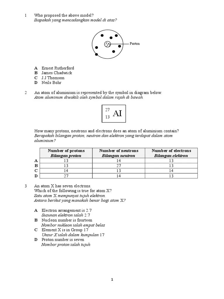 The nucleus is composed of protons and neutrons... (b) tulis persamaan setengah bagi pembentukan ion pada 1(a). (c) lukiskan susunan elektron untuk menunjukkan pemindahan elektron dalam pembentukan ikatan ion dalam sebatian aluminium fluorida. The atomic number of aluminium is 13.